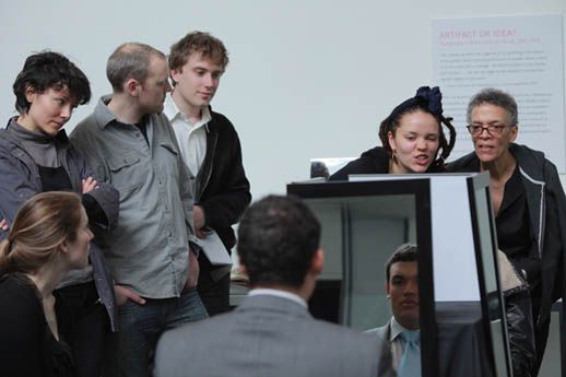 This is the 1 hour workshop prior to the "See Life" performance. Â Maren and Ava Hassinger, using mirrors(also used in the performance which followed), examine what Museum visitors have in common physically. Â The young man in the foreground is Jesse Hassinger - Maren's son, Ava's brother.