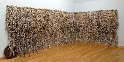 The Veil Between Us. 2007. Twisted and knotted New York Times newspapers. 5' high, 26' long, 6" deep. Installed at Maryland Art Place.