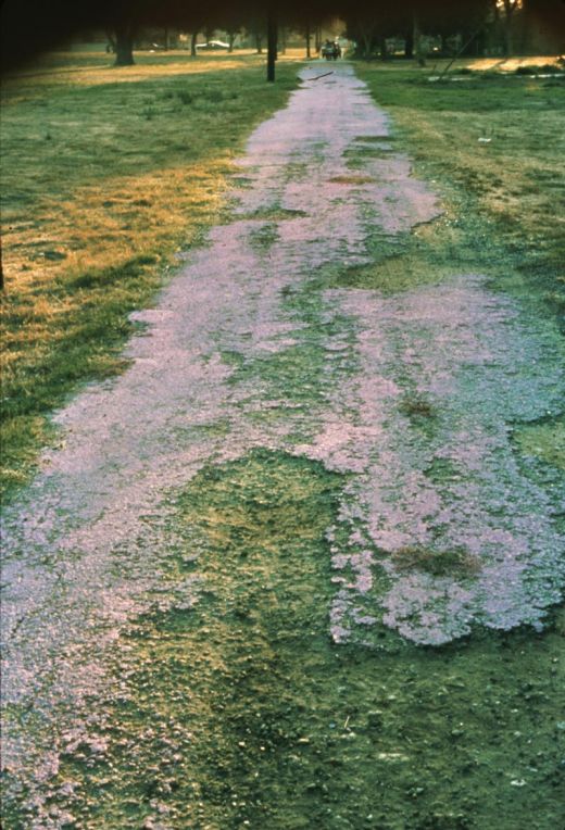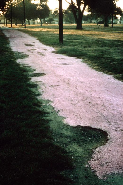 Pink Paths. 1982. Pink paint applied to the ground. 10' x 200'. This piece was installed on four paths in Lynwood, CA, a suburb of Los Angeles, which was largely abandoned. This view is of one of these paths.