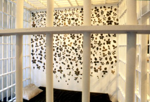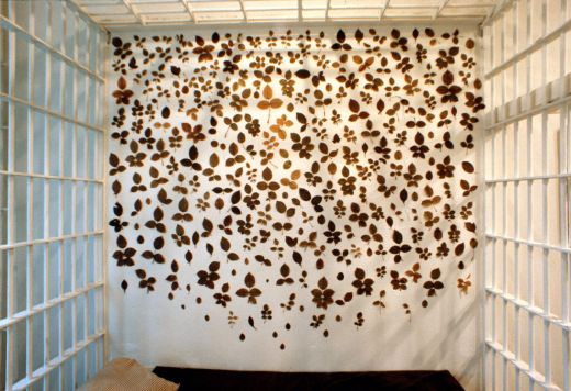 Remembering. 1982. Preserved rose leaves, cot, and pillow. 8' x 10' x 12'. Installed at SPARC art gallery in a cell in the jailhouse in Venice, CA.
